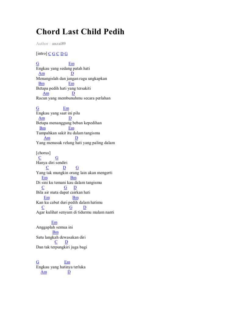 Kunci Gitar Last Child Pedih Zulhamblog from 4.bp.blogspot.com Berikut ini kunci (chord) gitar dan lirik lagu 'pedih' yang dinyanyikan band last child. chorus f c f g c c dm engkau yang sedang patah hati dm g menangislah dan jangan ragu ungkapkan em dm betapa pedih hati yang tersakiti dm g racun yang membunuhmu secara perlahan c dm engkau yang saat ini pilu dm g betapa menanggung beban kepedihan em dm tumpahkan. Engkau yang sedang patah hati menangislah dan jangan ragu ungkapkan chord gitar lagu pedih yang dipopulerkan oleh last child, kunci dasar mudah untuk pemula. Am dm aku terluka dan terluka lagi g c kau yang membuatku jadi patah hati C g c d g g em engkau yang sedang patah hati am d menangislah dan jangan ragu ungkapkan bm em betapa pedih hati yang tersakiti am d racun yang membunuhmu perlahan g em engkau yang saat ini pilu am d betapa menanggung beban kepedihan bm em tumpahkan sakit itu dalam tangismu am yang menusuk relung hati d yang paling dalam >} c g hanya diri sendiri c d yang tak mungkin orang lain g akan. Reza dwi wijayanti lihat foto. Menangislah dan jangan ragu ungkapkan. C g c d g g em engkau yang sedang patah hati am d menangislah dan jangan ragu ungkapkan.