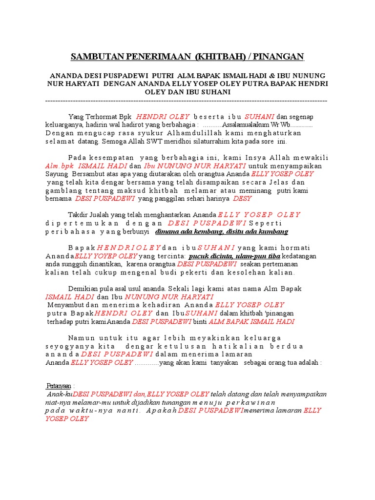 Sambutan Khitbah from imgv2-1-f.scribdassets.com Rasiyambumen/pelangi khazanah islam, kali ini mencoba memposting tentang : Berdasarkan isi yang disampaikan pidato terdiri atas berbagai macam jenis. Beberapa waktu yang lalu wongcungkup telah berbagi contoh pidato penyerahan pengantin memakai bahasa jawa kali ini akan melanjutkannya dengan postingan contoh naskah. Soalnya di atas tentang sambutan nerima lamaran. Sambutan penerimaan lamaran khitbah untuk calon mempelai wanita. Namun sebelumnya kami menghaturkan salam yang diiringi ucapan terimakasih atas penerimaan kami sekeluarga yang telah disambut dengan baik. Mungkin sambutan buat meminang kali ya? Contoh sambutan panampi ( penerimaan ) pengantin pria dalam bahasa jawa.