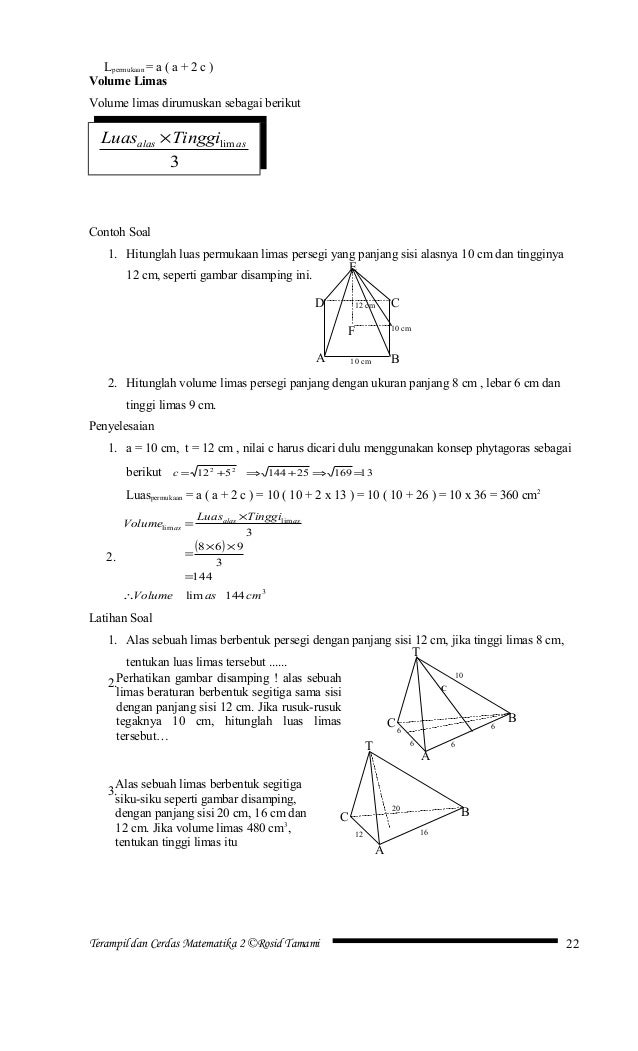 Alas sebuah prisma berbentuk belah ketupat dengan panjang diagonal 16 cm dan 20 cm.jika tinggi prisma tersebut tingginya 24 cm.volum prisma tersebut adalah…. Jika luas seluruh permukaan prisma 392 cm 2, volum prisma adalah…. $\begin{align} l_a &= \dfrac12.12.5\\ &= 30\\ \\ v &= l_a \times t\\ &= 30 \times 20\\ &= 600\ cm^3\\ \end{align}$ jawab: Luas permukaan prisma belah ketupat buku paket matematika bse 8 smp revisi 2017 uji kompetensi 8 youtube. Sebuah prisma alasnya berbentuk belah ketupat dengan panjang diagonal alas 12cm dan 16cm.