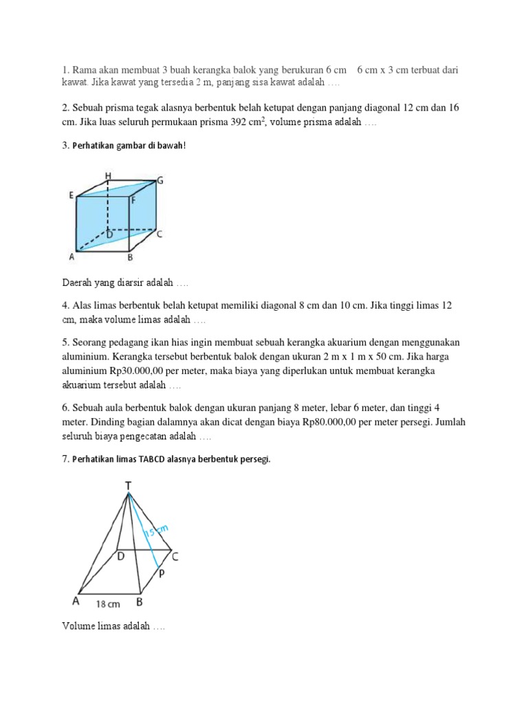 750 cm3 3.sebuah prisma tegak alasnya berbentuk belah ketupat dengan diagonal 18 cm dan 24 cm. Luas permukaan prisma tersebut adalah …. Prisma alasnya belah ketupat pj diagonal 16 cm dan 12 cm tentukan prisma luas permukaan nya. Alas nya = 10 cm; Luas permukaan prisma = (2 x luas belah ketupat) + (keliling belah ketupat x tinggi prisma) Tentukan luas permukaan prisma jika diketahui alasnya berbentuk belah ketupat mempunyai panjang diagonal 24 cm dan 10 cm dan tinggi 8 cm ! Dan jika tinggi dari prisma tersebut iyalah setinggi 20 cm, maka carilah berapa luas permukaan dari bangun prisma tersebut? Luas permukaan prisma belah ketupat buku paket matematika bse 8 smp revisi 2017 uji kompetensi 8 youtube. Sebuah prisma alasnya berbentuk segitiga siku siku dengan panjang sisi 6 cm 8 cm serta 10 cm dan tinggi prisma tersebut adalah 12 cm. $\begin{align} l_a &= \dfrac12.12.5\\ &= 30\\ \\ v &= l_a \times t\\ &= 30 \times 20\\ &= 600\ cm^3\\ \end{align}$ jawab: Dan tinggi prisma 12 cm.tentukan. Tentukan tinggi prisma jika luas permukaannya adalah 672 cm². Jika luas seluruh permukaan prisma 392 cm 2, volum prisma adalah….